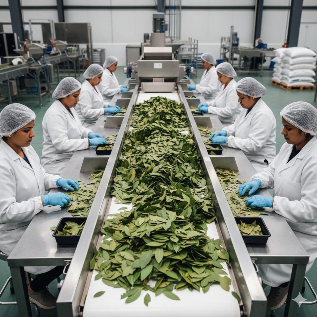Process: The product is separated from stems and foreign matter. It is then graded into various sizes—Whole Leaves, Crushed, or Fine Powder—according to client specifications.